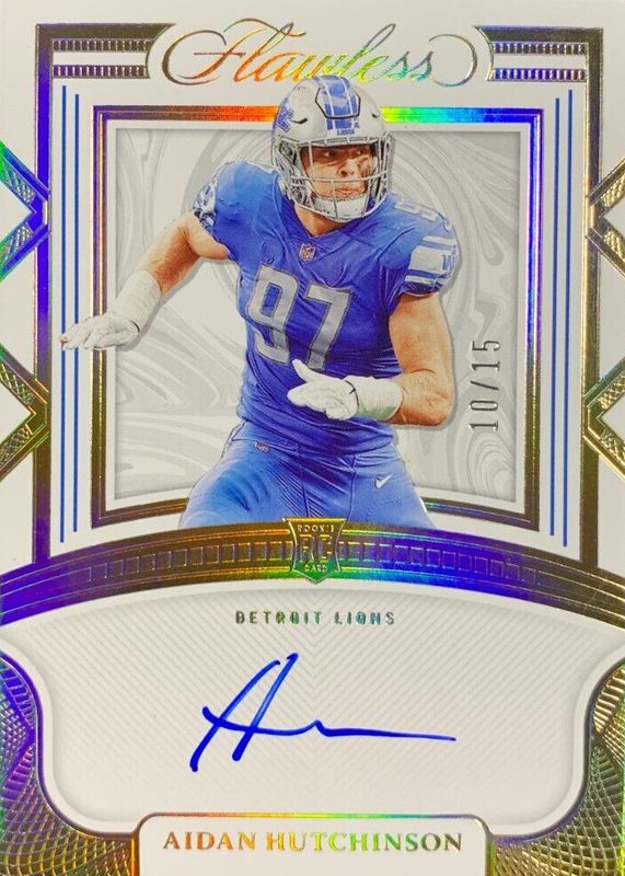 This card is 1 of 49 Aidan Hutchinson's card variations in the 2022 Flawless set being tracked by Sports Card Investor, including Rookie Debut Signatures (/20), Rookie Debut Signatures - Ruby (/10), Rookie Debut Signatures - Sapphire (/8), Rookie Debut Signatures - Silver (/15), and Rookie Frame Signatures (/15).