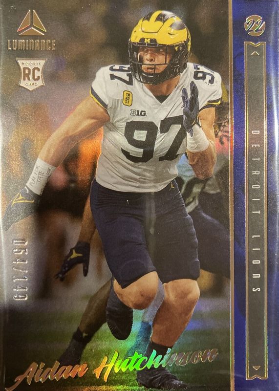 This card is 1 of 9 Aidan Hutchinson's card variations in the 2022 Luminance set being tracked by Sports Card Investor, including Base, Gold /249, Green /99, Orange /50, and Teal /35.