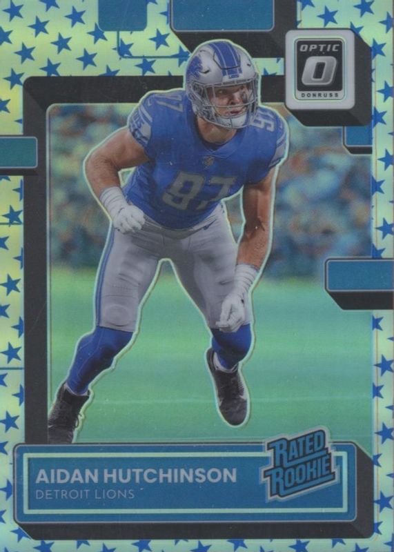 The Aidan Hutchinson 2022 Optic #213 Stars /(SSP) Rookie card in Raw condition has not changed in price in the last 30 days and was last sold for $6.49 .