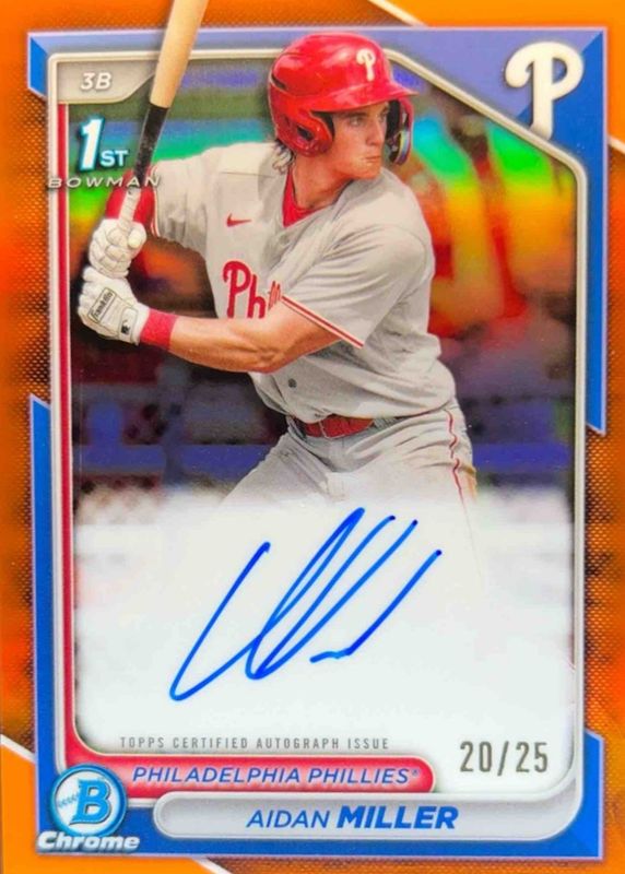 Auctions Ending Soon for Aidan Miller 2024 Bowman #CPA-AMI Chrome Prospect Auto - Orange Refractor /25 (1st) RAW