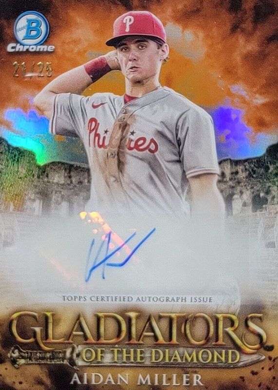 The Aidan Miller 2024 Bowman #GDA-AM Gladiators of the Diamond Autographs - Orange Refractor /25 card in Raw condition has not changed in price in the last 30 days and was last sold for $200.00 .