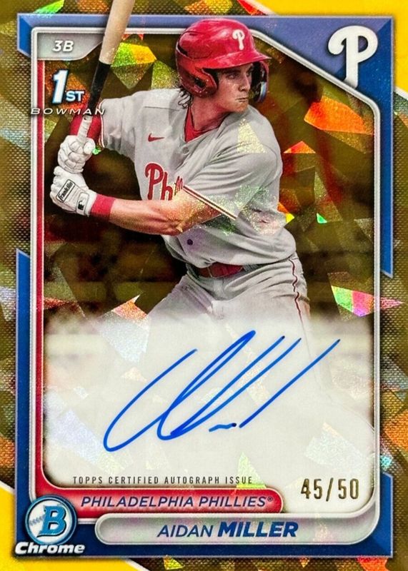 Best Prices Available For Sale of Aidan Miller 2024 Bowman Sapphire Edition #BSPA-AM Chrome Prospect Auto - Gold /50 (1st)