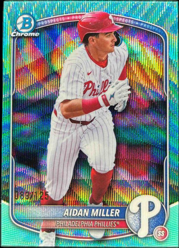 The Aidan Miller 2025 Bowman Draft #BDC-180 Chrome - Aqua Wave Refractor /125 card is 1 of 54 Aidan Miller's card variations in the 2025 Bowman Draft set being tracked by Sports Card Investor, including Base, Chrome, Chrome - Lazer Refractor, Chrome - Refractor, and Chrome - Sky Blue Refractor.