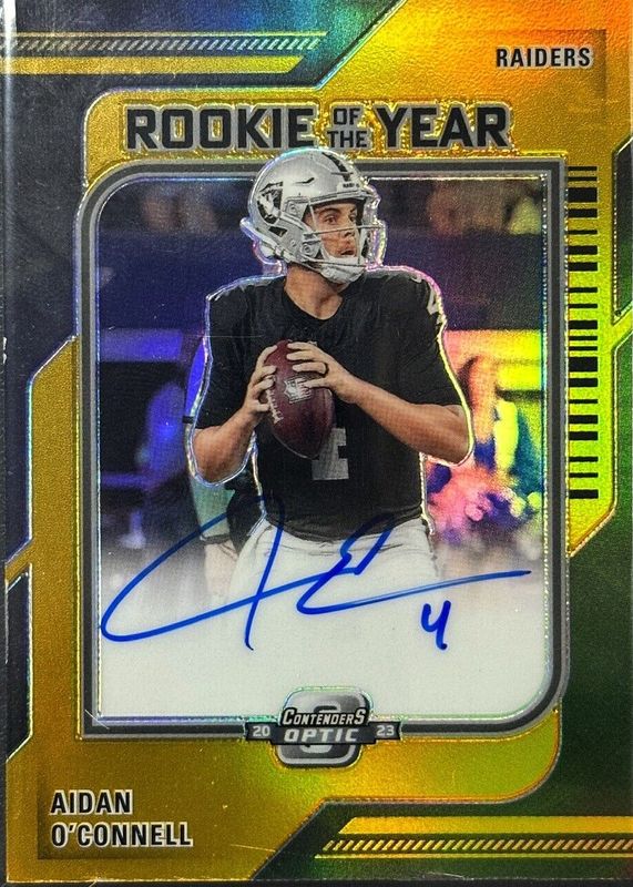 The Aidan O'Connell 2023 Contenders Optic #ROY-AO Rookie of the Year Contenders Autographs - Gold /10 card in Raw condition has not changed in price in the last 30 days and was last sold for $31.00 .