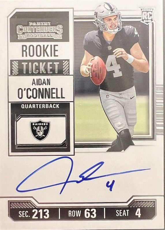 The Aidan O'Connell 2023 Contenders #101 Rookie Ticket Auto card in Raw condition has moved up $1.76 (+54.2%) in the last 30 days and was last sold for $5.01 .