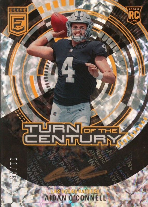 The Aidan O'Connell 2023 Elite #TC-AOC Turn of the Century Autographs - Black Gold /25 Rookie card in Raw condition has not changed in price in the last 30 days and was last sold for $45.00 .