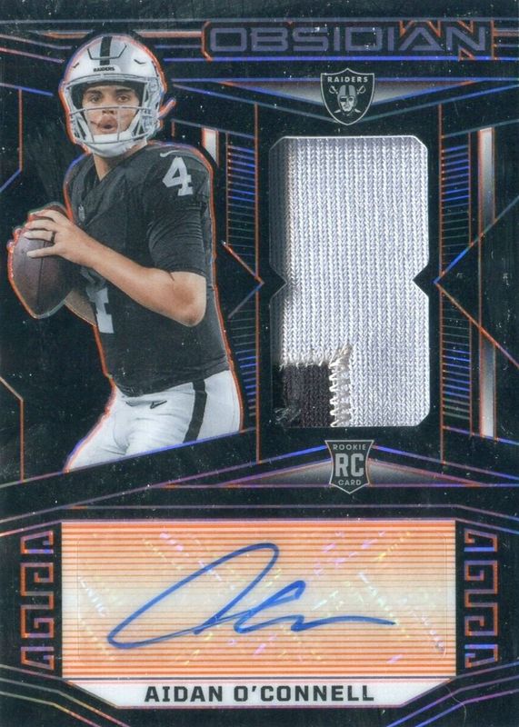 The Aidan O'Connell 2023 Obsidian #212 Rookie Jersey Autographs - Electric Etch Orange /49 card in Raw condition has not changed in price in the last 30 days and was last sold for $14.50 .