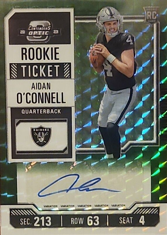 Aidan O'Connell 2023 Zenith #127 Contenders Optic Rookie Ticket Auto Preview - Green /23 (Shoe Visible) RAW Price Guide
