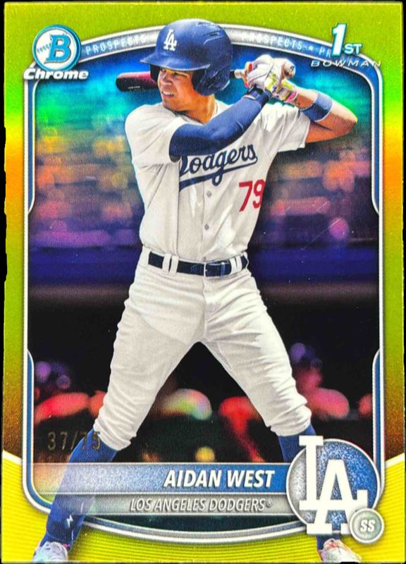 The Aidan West 2025 Bowman Draft #BDC-6 Chrome - Yellow Refractor /75 card is 1 of 84 Aidan West's card variations in the 2025 Bowman Draft set being tracked by Sports Card Investor, including Base, Chrome, Chrome - Lazer Refractor, Chrome - Refractor, and Chrome - Sky Blue Refractor.