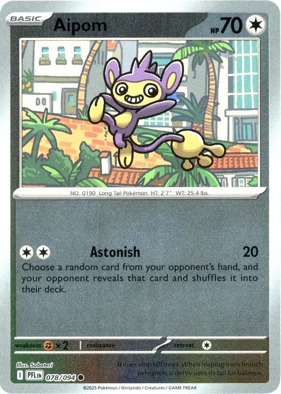 The Aipom 2025 Mega Evolution: Phantasmal Flames #78/94 Reverse Holo card in Raw TCG (Near Mint) condition has moved down -$0.54 (-30.7%) in the last 30 days and was last sold for $1.21 .