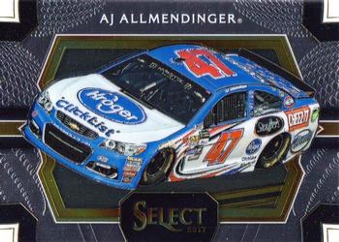 The AJ Allmendinger 2017 Select NASCAR #115 Base card is 1 of 50 AJ Allmendinger's card variations in the 2017 Select NASCAR set being tracked by Sports Card Investor, including Base, Purple Pulsar, Silver, Red White & Blue Pulsar /299, and Blue /199.