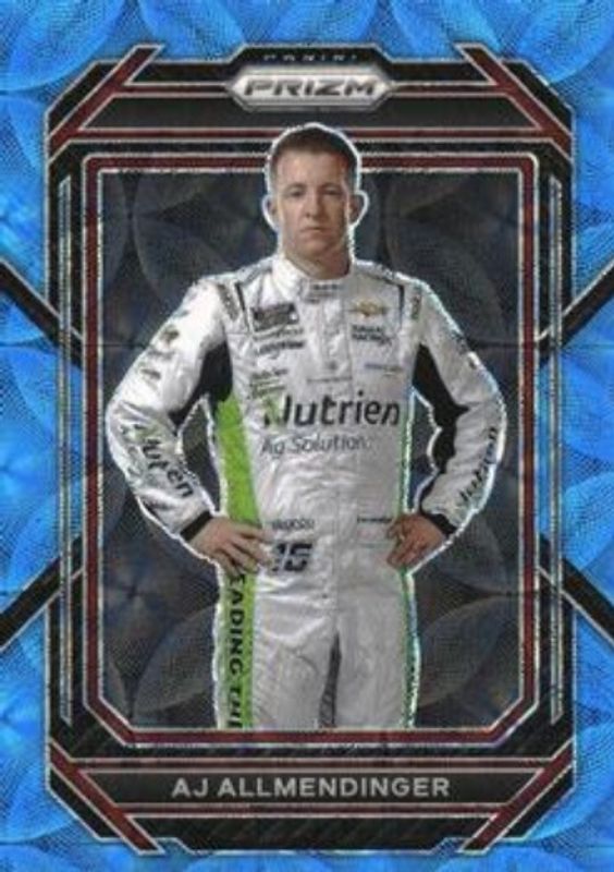 The AJ Allmendinger 2023 Prizm NASCAR #41 Carolina Blue Scope /99 card is 1 of 50 AJ Allmendinger's card variations in the 2023 Prizm NASCAR set being tracked by Sports Card Investor, including Base, Hyper Blue & Carolina Blue, Hyper Purple & Yellow, Reactive Orange, and Red.