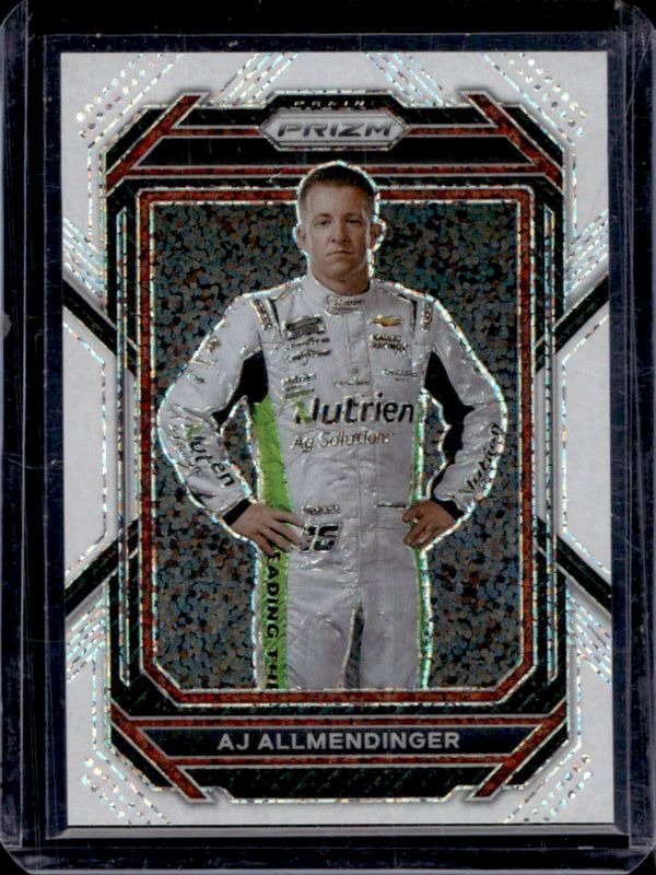 The AJ Allmendinger 2023 Prizm NASCAR #41 White Sparkles card is 1 of 50 AJ Allmendinger's card variations in the 2023 Prizm NASCAR set being tracked by Sports Card Investor, including Base, Hyper Blue & Carolina Blue, Hyper Purple & Yellow, Reactive Orange, and Red.