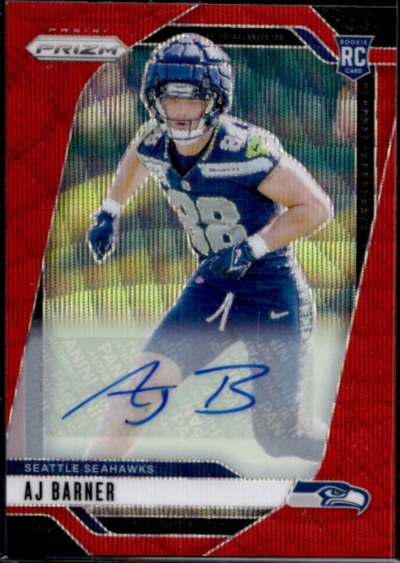 The AJ Barner 2024 Prizm #304 Base Autographs - Red Wave /149 card is 1 of 84 AJ Barner's card variations in the 2024 Prizm set being tracked by Sports Card Investor, including Base, Choice Blue Yellow Green, Choice Silver, Disco, and Green.