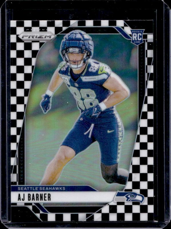 The AJ Barner 2024 Prizm #304 Black & White Checker /(SSP) card is 1 of 84 AJ Barner's card variations in the 2024 Prizm set being tracked by Sports Card Investor, including Base, Choice Blue Yellow Green, Choice Silver, Disco, and Green.