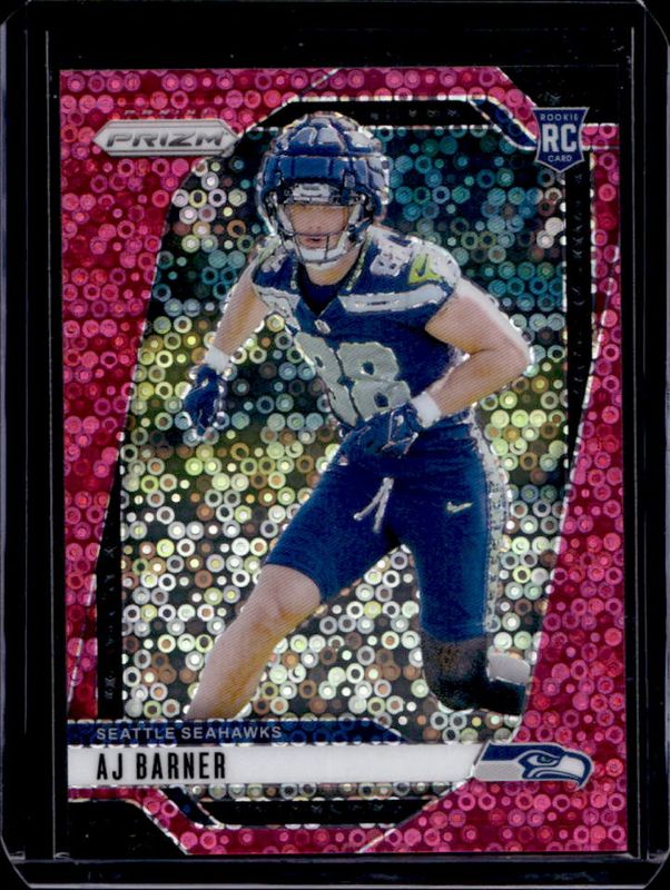 The AJ Barner 2024 Prizm #304 No Huddle Pink /25 card is 1 of 84 AJ Barner's card variations in the 2024 Prizm set being tracked by Sports Card Investor, including Base, Choice Blue Yellow Green, Choice Silver, Disco, and Green.