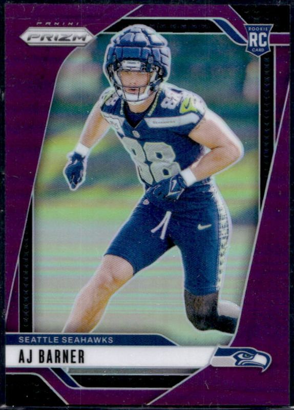 The AJ Barner 2024 Prizm #304 Purple /125 card is 1 of 84 AJ Barner's card variations in the 2024 Prizm set being tracked by Sports Card Investor, including Base, Choice Blue Yellow Green, Choice Silver, Disco, and Green.