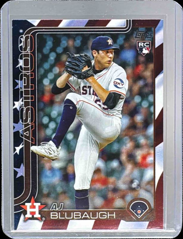 The AJ Blubaugh 2025 Topps Update #US177 Independence Day /76 Rookie card is 1 of 59 AJ Blubaugh's card variations in the 2025 Topps Update set being tracked by Sports Card Investor, including Base, Aqua Holo Foil, Aqua Rainbow Foil, Diamante Foil, and Holiday.