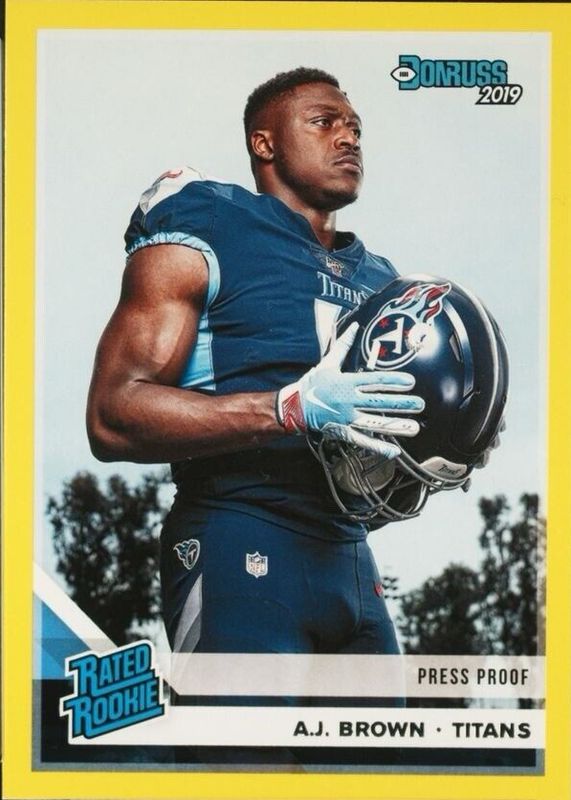 The AJ Brown 2019 Donruss #314 Press Proof Yellow Rookie card in Raw condition has moved up $4.43 (+172%) in the last 30 days and was last sold for $7.00 .