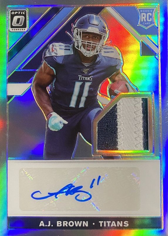 The AJ Brown 2019 Optic #RPA-AJB Rookie Patch Auto (/10) card in Raw condition has not changed in price in the last 30 days and was last sold for $754.99 .