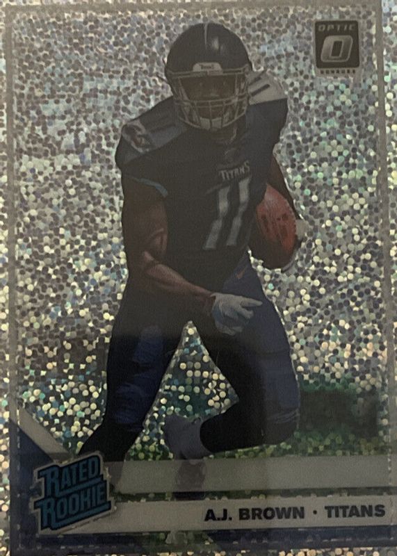 The AJ Brown 2019 Optic #164 White Sparkle /(SSP) Rookie card in Raw condition has not changed in price in the last 30 days and was last sold for $213.50 .