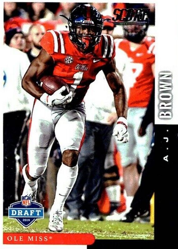The AJ Brown 2019 Score #DFT-10 NFL Draft Rookie card in Raw condition has not changed in price in the last 30 days and was last sold for $1.99 .