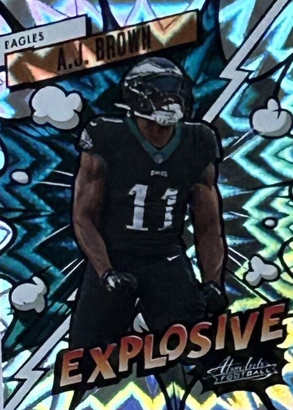 The AJ Brown 2023 Absolute #28 Explosive /(SSP) card in Raw condition has moved up $35.00 (+38.9%) in the last 30 days and was last sold for $125.00 .
