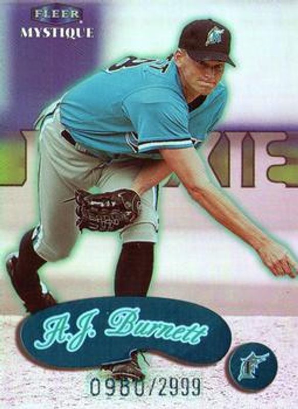 The AJ Burnett 1999 Fleer Mystique #110 Base /2999 Rookie card is 1 of 5 AJ Burnett's card variations in the 1999 Fleer Mystique set being tracked by Sports Card Investor, including #110 Masterpiece /1, #3 Prophetic /1999, #3-P Prophetic /1999, and Fresh Ink /500.