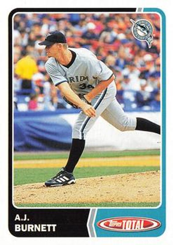 The AJ Burnett 2003 Topps Total #56 Base card is 1 of 2 AJ Burnett's card variations in the 2003 Topps Total set being tracked by Sports Card Investor, including Silver.