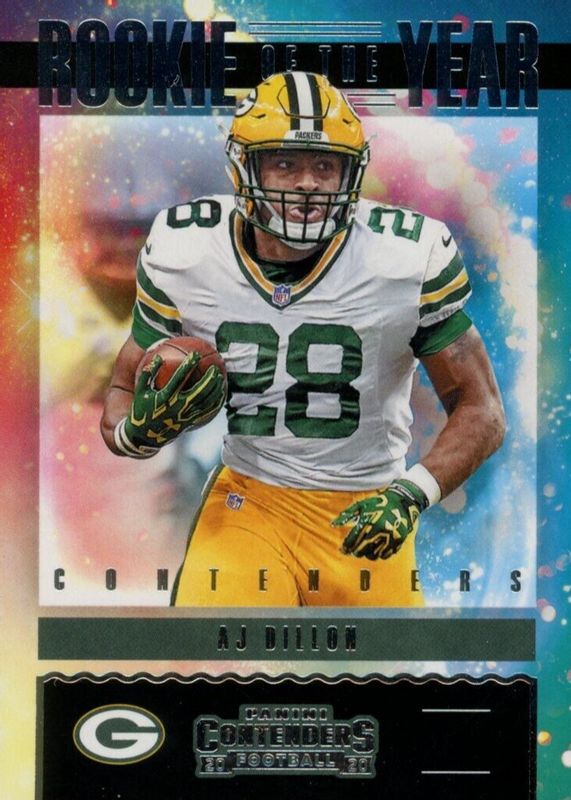 The AJ Dillon 2020 Contenders #RY-AJD Rookie of the Year Contenders card in Raw condition has not changed in price in the last 30 days and was last sold for $2.49 .