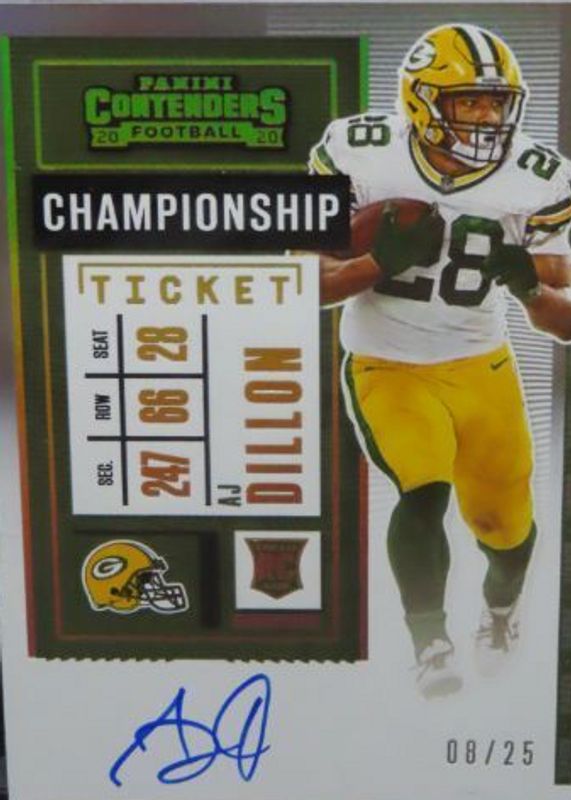 The AJ Dillon 2020 Contenders #126 Rookie Ticket Auto Variation - Championship Ticket /25 card in Raw condition has not changed in price in the last 30 days and was last sold for $75.00 .