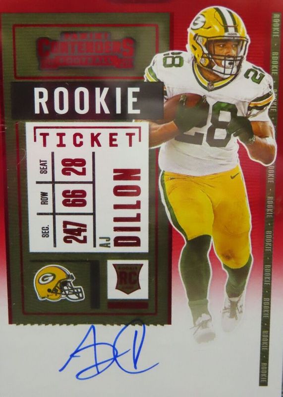 The AJ Dillon 2020 Contenders #126 Rookie Ticket Auto Variation - Red Zone Ticket card in Raw condition has not changed in price in the last 30 days and was last sold for $9.50 .
