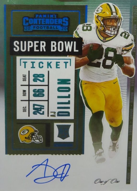 The AJ Dillon 2020 Contenders #126 Rookie Ticket Auto Variation - Super Bowl Ticket /1 card in Raw condition has not changed in price in the last 30 days and was last sold for $405.00 .