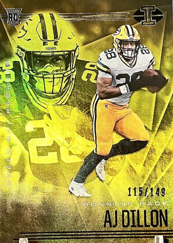 The AJ Dillon 2020 Illusions #26 Trophy Collection Yellow /149 Rookie card in Raw condition has not changed in price in the last 30 days and was last sold for $2.00 .