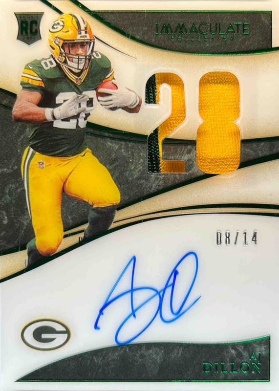The AJ Dillon 2020 Immaculate #IN-AJD Immaculate Numbers Rookie Patch Autographs - Premium Edition /14 card in Raw condition has not changed in price in the last 30 days and was last sold for $15.50 .