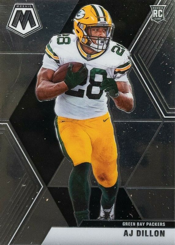 The AJ Dillon 2020 Mosaic #226 Base Rookie card in Raw condition has not changed in price in the last 30 days and was last sold for $3.00 .