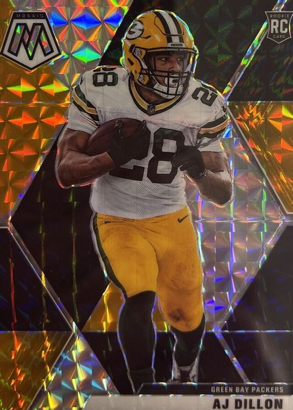 This card is 1 of 74 AJ Dillon's card variations in the 2020 Mosaic set being tracked by Sports Card Investor, including Base, NFL Debut, Choice Red & Green, Green, and NFL Debut - Choice Red & Green.