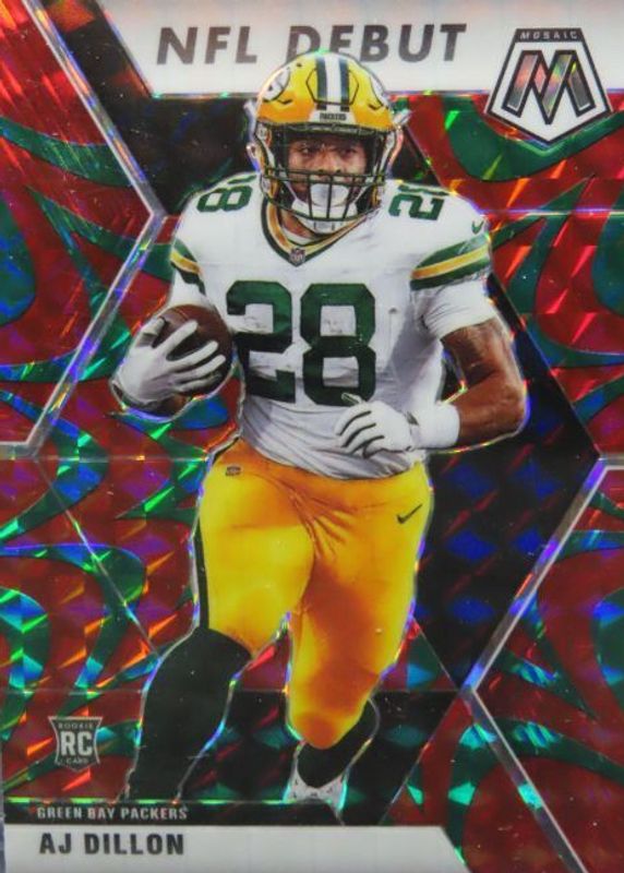The AJ Dillon 2020 Mosaic #279 NFL Debut - Choice Red & Green Rookie card in Raw condition has not changed in price in the last 30 days and was last sold for $4.99 .
