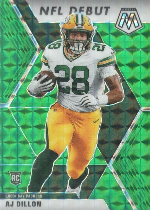 The AJ Dillon 2020 Mosaic #279 NFL Debut - Green Rookie card in Raw condition has not changed in price in the last 30 days and was last sold for $12.00 .