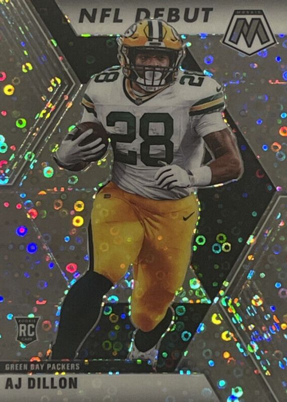 The AJ Dillon 2020 Mosaic #279 NFL Debut - No Huddle Rookie card in Raw condition has not changed in price in the last 30 days and was last sold for $5.69 .