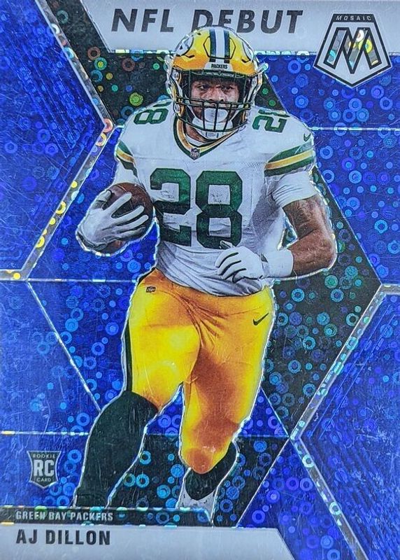 The AJ Dillon 2020 Mosaic #279 NFL Debut - No Huddle Blue /75 Rookie card in Raw condition has not changed in price in the last 30 days and was last sold for $5.00 .