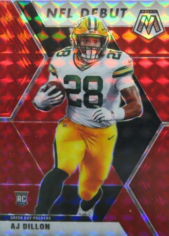 The AJ Dillon 2020 Mosaic #279 NFL Debut - Red Rookie card in Raw condition has not changed in price in the last 30 days and was last sold for $4.99 .
