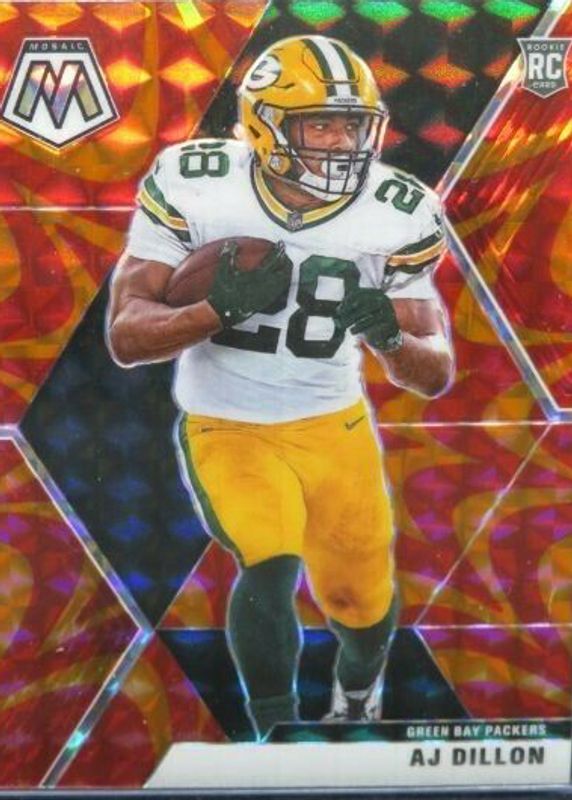 The AJ Dillon 2020 Mosaic #226 Reactive Orange Rookie card in Raw condition has not changed in price in the last 30 days and was last sold for $1.00 .