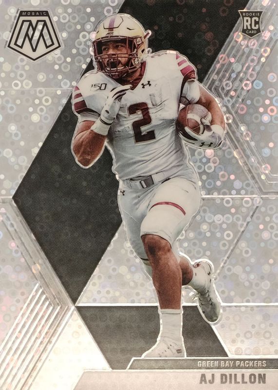 The AJ Dillon 2020 Mosaic #226 Rookie Variation - No Huddle card in Raw condition has not changed in price in the last 30 days and was last sold for $1.65 .