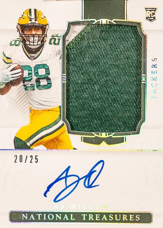 The AJ Dillon 2020 National Treasures #181 Rookie Patch Auto - Holo Silver /25 card in Raw condition has not changed in price in the last 30 days and was last sold for $30.00 .