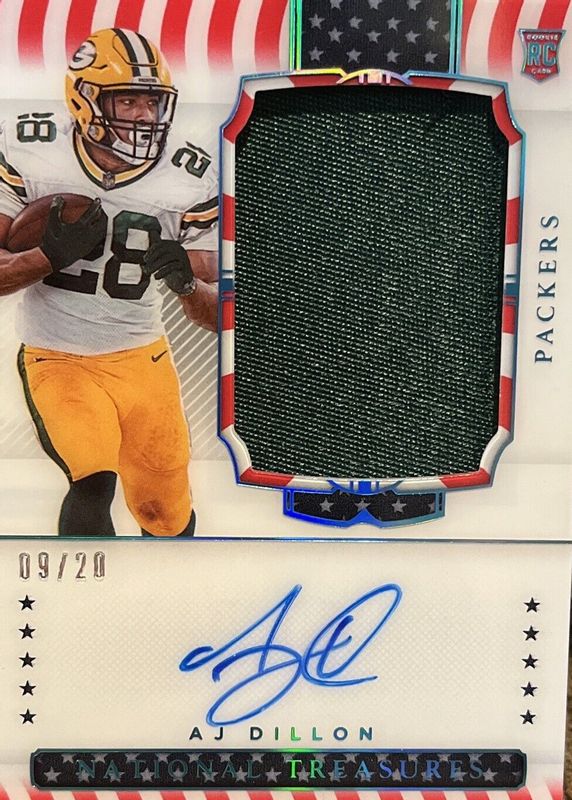 The AJ Dillon 2020 National Treasures #181 Rookie Patch Auto - Stars & Stripes /20 card in Raw condition has not changed in price in the last 30 days and was last sold for $200.00 .