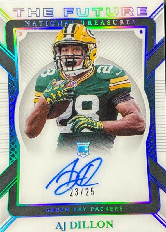 The AJ Dillon 2020 National Treasures #TF-AD The Future Autographs /25 Rookie card in Raw condition has not changed in price in the last 30 days and was last sold for $41.65 .