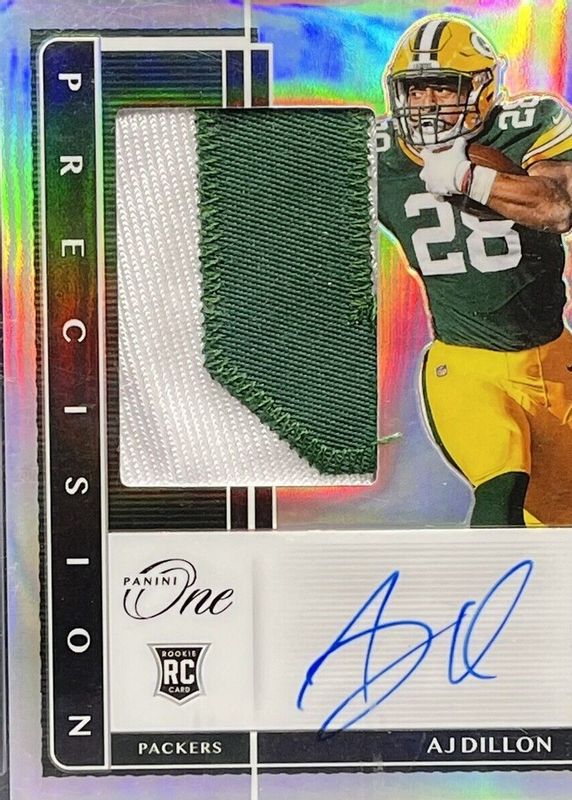 The AJ Dillon 2020 One #324 Precision Rookie Patch Autographs (/49) card in Raw condition has not changed in price in the last 30 days and was last sold for $29.00 .