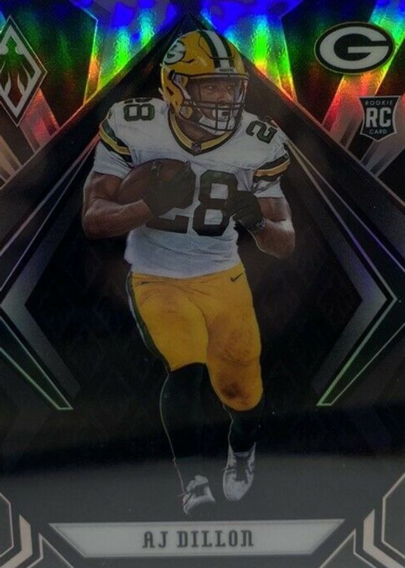 This card is 1 of 15 AJ Dillon's card variations in the 2020 Phoenix set being tracked by Sports Card Investor, including Base, Color Burst, Fire Burst, Silver, and Red /299.