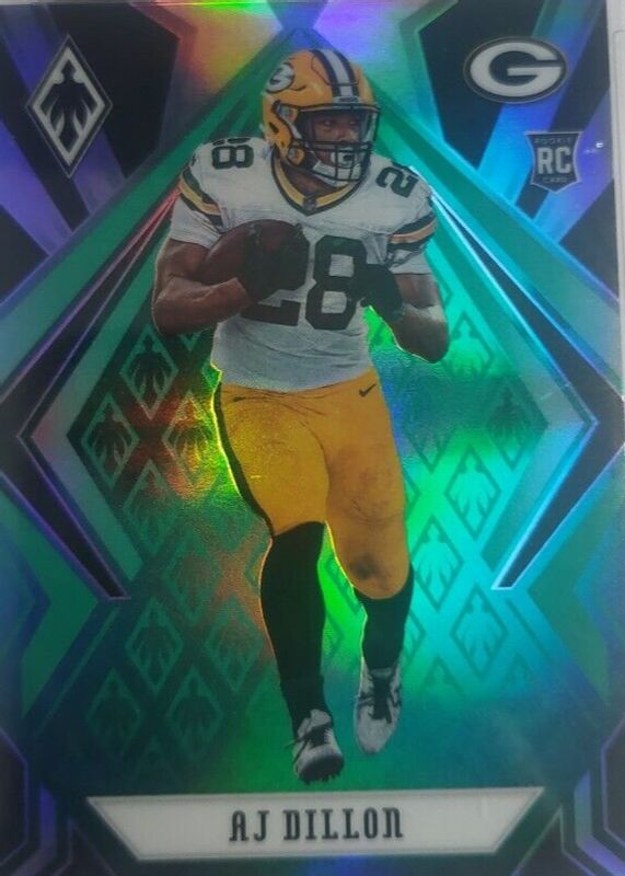 This card is 1 of 15 AJ Dillon's card variations in the 2020 Phoenix set being tracked by Sports Card Investor, including Base, Color Burst, Fire Burst, Silver, and Red /299.